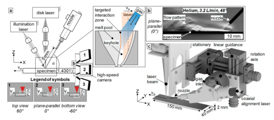 For the local supply of the gas, the setup was equipped with a nozzle unit (Figure 1c). A three-dimensional positioning of the nozzle was realized by three linear guides and one rotary disk. In this way, the system could be positioned with an accuracy of 0.05 mm and a reproducibility of 0.02 mm. Based on the findings of preliminary investigations [29,30], the nozzle was set to a trailing flow orientation with an angle of incidence of α = 48, while these settings resulted in the maximum reduction of loss of mass. This should ensure a direct interaction of the gas flow and the keyhole rear wall. Moreover, the unit was equipped with a coaxial alignment laser, which allowed the marking of the interaction area between the gas flow and the specimen. The nozzle tube of the unit had an inner diameter of 1.2 mm and were positioned in a constant distance from the nozzle tip to the specimen surface of 5 mm. All experiments were repeated for three times for statistical purposes. The error bars depicted in all graphs represent the standard deviation.