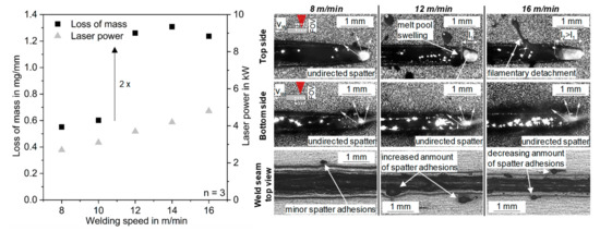 New developments in the field of solid-state lasers has led to the availability of higher power classes at relatively low investment costs. These power classes offer the potential to significantly increase the processing speed in various applications result in a considerable improvement of economic efficiency. However, the potential cannot yet be utilized for laser beam welding of high-alloyed steels. When welding with high welding speeds ≥8 m/min, process instabilities occur, which negatively affect welding quality [1]. In this context, spatter formation must be particularly emphasized as the loss of mass results in adhering spatters as well as in affected mechanical properties. The process of spatter formation can be attributed to two basic mechanisms [1,2,3,4]. The first mechanism is significant for welding speeds up to approx. 8 m/min and assumes that the spatter detachment takes place within the keyhole. While the keyhole is characterized by the formation of steps on the front and the rear side of the keyhole wall, the escaping metal vapor interacts with the molten material [5]. Based on the windage of the steps, an impulse is transferred from the escaping metal vapor to the molten material. As a result, spatters can be detached in undirected spatter trajectories. When increasing the welding speed beyond 8 m/min, the key mechanism in spatter formation changes. According to the increase in keyhole inclination at high welding speeds, the energy absorption at the keyhole front is rising [3]. As a result, the metal vapor flow induced is directed towards the keyhole rear wall. Based on the interaction of the metal vapor and the rear wall, the melt pool fluctuates and starts to move along welding direction. If the transferred impulse exceeds a critical threshold, spatter formation occurs [4,6,7]. This relation can be given by the condition of spatter formation (Equation (1)). For the extraction of one single spatter, the kinetic energy of the fluid element in the melt (Ekin,fl) must be greater than the sum of the kinetic energy of the droplet (Ekin,dr) and the surface energy of the melt (Esurf,fl) [8,9].