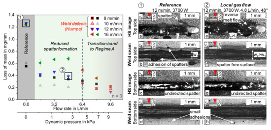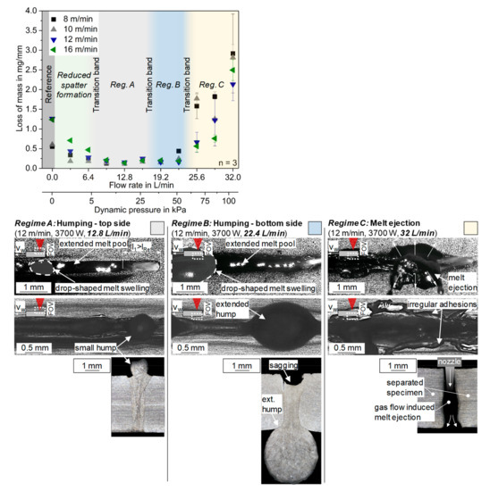 The investigation started with the lowest flow rate of 1.6 L/min. Thereby, it was possible to determine a significant reduction in the loss of mass by up to 67% in comparison to the reference process. With a further increase of the flow rate, the loss of mass fell to a minimum of ≈0.2 mg/mm at 9.6 L/min, independent of the welding speed. However, an increase in flow rate from 6.4 L/min onwards contributed to the formation of some weld defects. These parameters are highlighted by a red outline in Figure 4. In this context, the top side of the weld seam showed the formation of small and irregular occurring humps (cf. regime A). In order to avoid weld defects, the following investigations were carried out using the sound parameters at the lowest loss of mass (Table 3).