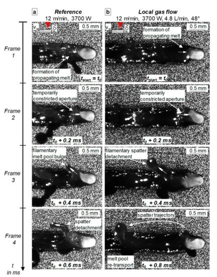 The spatter formation mechanism of the reference process at 12 m/min (single wave regime) is characterized by the formation of a melt pool swelling at the rear side of the keyhole (see Section 3.1). Due to a propagating movement of the melt in welding direction (Frame 1 Figure 5a), the keyhole is temporarily constricted (Frame 2 Figure 5a). Following, the transferred impulse of the upwards rising metal vapor flow to the rear sided melt is significantly increased. Consequently, this leads to a filamentary bulging of the top-sided melt (Frame 3, Figure 5a). If the kinetic energy of the propagating melt exceeds the condition of spatter formation (see Equation (2)), the spatter is detached from the melt pool (Frame 4, Figure 5a). Comparing the reference process to the applied local gas flow, the formation of a rear-sided melt pool swelling could be observed as well (Frame 1, Figure 5b). However, the melt pool swelling occurs less frequent. Following, the formation of spatter is reduced. Based on the stabilized keyhole rear wall, a reverse melt flow into the downstream melt pool is initiated. Due to the additional transferred impulse of the gas to the melt pool, the accelerated melt may haves a higher kinetic energy [27], which can be justified as reason for the melt pool elongation. However, in the case of a melt pool propagation, the aperture of the keyhole is also temporarily affected (Frame 2, Figure 5b). Spatters are detached in the same way as described on the reference process as a result (Frame 3, Figure 5b). In contrast to the reference process, the detached spatter mostly has a significantly lower kinetic energy. Thus, the spatters are re-transported to the melt pool due to a more curved spatter trajectory (Frame 4, Figure 5b).