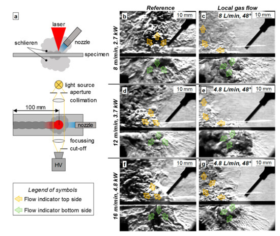 (a) Schematic of used schlieren setup; (b–g) Schlieren records of the reference and gas-assisted process (argon) depending on welding speed.