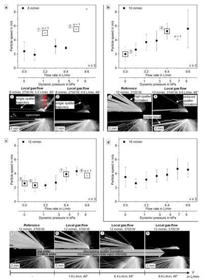 At a welding speed of 8 m/min, the curve of particle speed was not significantly affected by varying flow rates (Figure 7a), except measuring points with a low detection rate of n < 3. By increasing the welding speed to 10 m/min (Figure 7b), the particle speed of the reference process was not affected. Using the local gas flow, the particle speed raised by an increase in flow rate. Based on the starting values of the reference process of approximately 2.0 ± 0.98 m/s, the particle speed increased to a maximum of approximately 5.6 ± 2.7 m/s at a flow rate of 9.6 L/min. This relation can be attributed to an enhanced impulse transfer, while the applied dynamic pressure is rising by an increase in flow rate (see Equation (4)). Furthermore, the change in spatter formation mechanism from 8 m/min (Rosenthal regime) to 10 m/min (single wave regime) contributes to the detachment of larger spatters (see Section 3.1). Due to an increase in windage, the transmitted impulse from the gas to the spatter can be affected, which can result in a change of particle speed. At welding speeds of 12 m/min (Figure 7c) and 16 m/min (Figure 7d), the correlation of particle speed and flow rate shows a similar characteristic as described before at a welding speed of 10 m/min