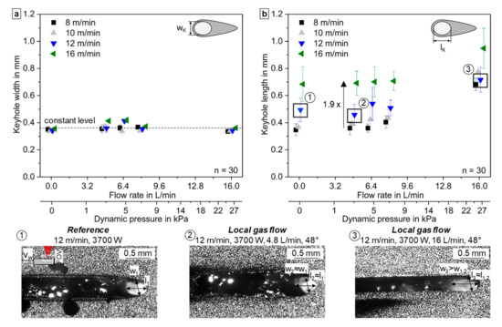 By analyzing the keyhole width (Figure 8a), no significant effect of flow rate neither of welding speed could be determined, while the keyhole was characterized by a mean width of ≈0.38 mm. In contrast, the length of the keyhole showed varying dimensions (Figure 8b). Based on the increase in keyhole inclination at high welding speeds (see Section 1), the length of the keyhole of the reference process was raised by up to factor of 1.9 by varying welding speeds from 8 m/min to 16 m/min. Additionally, a change in flow rate showed an effect. While flow rates up to 8 L/min resulted in constant dimensions, the keyhole length was noticeably increased by a change in flow rate from 8 L/min to 16 L/min. Consequently, it can be stated that the gas flow induced compressive force inside the keyhole had to exceed a critical threshold to have an influence on keyhole dimensions by melt displacement. This threshold seems to correlate to a resulting dynamic pressure of about 6.7–26.8 kPa in this investigation. Below this critical compressive force, the changes in keyhole length can be attributed to the rising keyhole inclination at high welding speeds. However, to quantify this threshold, further investigations are required, to consider the effects of flow orientation, gas type, thermophysical and rheological material properties as well as the regime of welding process.