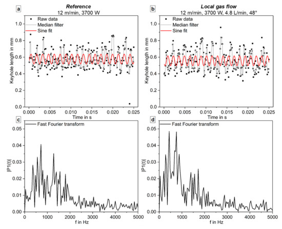 Based on the investigations of the static keyhole dimensions, the keyhole length was analyzed depending on time by quantifying the frequency and the normalized amplitude of keyhole fluctuation, in order to specify the effect of the gas flow on keyhole dynamics (Figure 9). For this purpose, the length of the keyhole was measured in 250 sequential frames by an increment of 0.01 ms. Subsequently, the determined raw data was processed using a median filter to limit measurement irregularities. Following, using a fast Fourier transformation algorithm (FFT), it was possible to calculate the normalized amplitude and the frequency of keyhole fluctuations. In order to approve the found solution and to get an information about the harmonicity of the fluctuation, a sine was fitted into the filtered data based on the determined oscillating period.