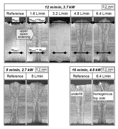 After analyzing the effect of the gas flow on the flow field conditions, spatter formation mechanism as well as static and dynamical keyhole dimensions, the effect of the gas flow was characterized on the weld seam geometries in order to determine a change in energy absorption and melt flow conditions (Figure 10). Based on cross-sections, the seam width was measured at the bottom side as well as inside the specimen (two thirds of specimen thickness).