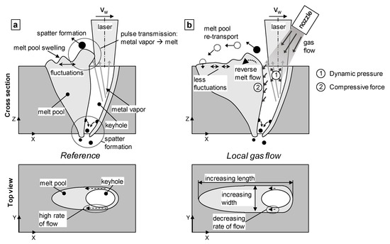 In order to form a stable and less fluctuating keyhole, the opening pressures must be at least equal or greater than the closing pressures of the keyhole [12]. In this context, numerous parameters have been investigated for manipulating the pressure balance. Despite solutions using laser beam shaping [13,14,15,16], power modulation [17,18], or vacuum systems [19,20], the use of local gas flows represents a technically feasible solution. By using the gas flow, the pressure balance is affected by an additionally exerted dynamic pressure depending on the density ρgas and the flow velocity vgas of the supplied gas (Equation (4)) [21]. As a result, the opening pressures are amplified by the relative dynamic pressure . Besides the general pressure increase, a compressive force is also exerted in the field of interaction.