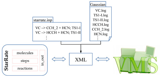 Another important module of StarRate is in_out, which handles the input and output operations of the program. Input data are accessed by StarRate through an XML interface based on the same versatile hierarchical data structure that is adopted by VMS. (The current version of VMS reads data in the JSON format, so that a straightforward conversion from XML to JSON is in order. This can be easily done, for instance, using xml2json (https://github.com/hay/xml2json), or online converters such as https://www.convertjson.com/xml-to-json.htm). At the beginning, the user has to prepare a very simple input file encoding a reaction scheme (see the starrate.inp box in Figure 1) and gather all the files, one for each molecular species, containing data deriving from electronic-structure calculations. These can be either in an internal standard format (similar to that adopted in the EStokTP [22] package) or directly output files of quantum-chemistry packages, as exemplified in Figure 1 for the case of the Gaussian package. Currently StarRate supports output files from this quantum-chemistry package (.log extension), though support for other popular electronic-structure programs is presently being pursued (see also Refs. [23,24] on the issue of interoperability and common data formats in quantum chemistry). Then, a Python script is run which extracts data from the output files generated by the quantum-chemistry calculations and, driven by the reaction scheme, collects the information in the proper sections of the XML file.