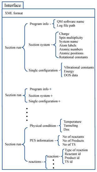 The structure of the XML interface is schematized in Figure 2. The whole XML document develops under a root element named escdata. The escdata has one child element for each molecule named section_run. Each of these elements contains three nodes: program_info, section_system, and system_single_configuration_calculation. All the information regarding a molecule is handled by these three sibling nodes. The program_info node contains two subnodes which keep track of quantum chemical software name and .log file location. The section_system node contains basic information which does not require quantum chemical information (viz., molecular charge, spin multiplicity, atom label, atomic numbers, rotational constants). The last sibling, system_single_configuration_calculation, contains information which requires quantum chemical calculations (viz., vibrational constants, SCF energy, density of state data). Finally, the last section_run collects information on physical conditions and on the reaction under study. For illustrative purposes, the actual .xml file for the reaction studied in Section 3 is given as Supplementary Materials.