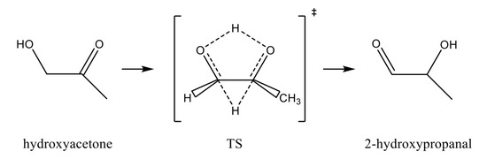 The interconversion reaction between hydroxyacetone and 2-hydroxypropanal is an important reaction in the context of atmospheric chemistry because the hydroxyacetone represent the simplest form of photochemically oxidised volatile organic compounds [26]. In a recent study, Sun et al. [27] have considered the interconversion mechanisms on several hydroxycarbonyl compounds, and much attention has been focused on the interconversion reaction between hydroxyacetone and 2-hydroxypropanal. This isomerization reaction can occur through three different mechanisms, 2 high-barrier multistep processes and, as shown in Figure 3, a direct mechanism via double hydride shift involving a low-barrier concerted transition state.