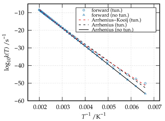 which essentially implies a linear variation of the activation energy with the temperature, . The Arrhenius best-fitting curve for both the tunneling-corrected and no-tunneling data are shown in Figure 5 as dashed black line and solid black line, respectively. The Arrhenius–Kooij best-fitting curve for the tunneling-corrected data is also reported as a red dashed line in the same figure, while the best-fitting parameters together with the associated coefficient of determination are given in Table 1.