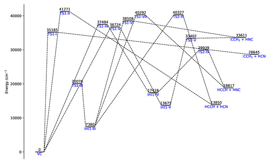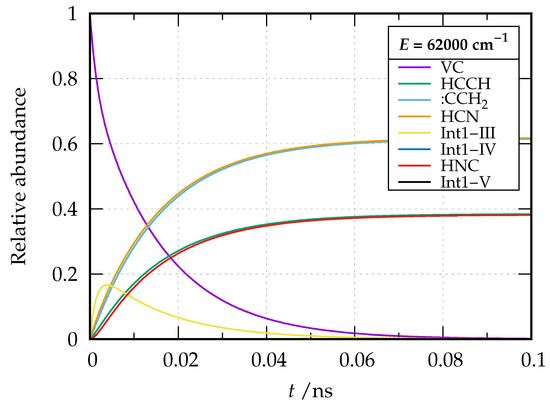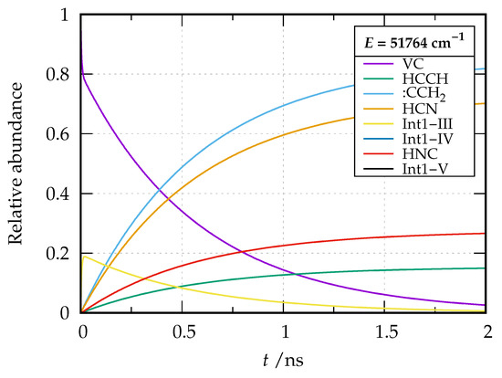 In our calculations, the initial concentration of VC was taken as 1.0 and the concentration of other species was set to 0.0. The relative abundances of the involved species as a function of time are plotted for two energies, namely cm and cm, in Figure 8 and Figure 9, respectively.