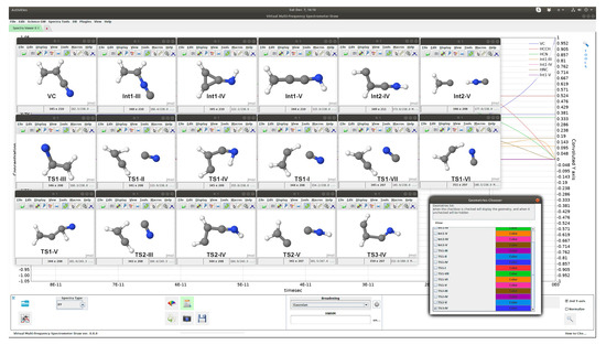 As shown in Figure 6 and Table 2, VC can directly dissociate to product sets :CCH + HCN and HCCH + HCN through steps 1 and 2 (the only direct dissociation paths), or lead to formation of reaction intermediates Int1-III (the most stable one), Int1-IV, and Int1-V, further evolving to products. On the other hand, product HNC can only be formed via indirect dissociation paths involving the above-mentioned intermediates. A screenshot of VMS showing the structures of all the molecular species involved in this reaction is given in Figure 7.