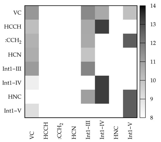 where is the concentration vector at . In this model, a fundamental hypothesis is that collisional relaxation occurs on time scales much shorter than those that characterize phenomenological kinetics [37]. It is worth mentioning here that a more general version of the master equation would involve diagonalizing a much larger matrix explicitly including collisional relaxation [36]. However, if the above-mentioned hypothesis holds, the resulting eigenvalues would appear in two separated sets: one made up by so-called internal energy relaxation eigenvalues (IEREs) and one made up by so-called chemically significant eigenvalues (CSEs). These last eigenvalues that relate to the phenomenological kinetics of interest in interstellar space and atmospheric studies would be identical to those obtained by solving Equation (9).