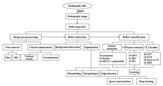The peer-reviewed journals from a variety of fields including Expert Systems with Applications, NDT&E International, Fuzzy Sets and Systems, Information Sciences, Journal of Manufacturing Systems and so on. Weld defect detection automation has always been a topic of interest for NDT&E International. After conducting a comprehensive literature analysis through the literatures, it can be summarized that the automatic detection systems for weld defect mainly involve several technologies: image pre-processing, defect segmentation, feature extraction and selection, classification. Figure 1 shows a classical procedure welding defect detection system involving these aspects []. In our paper, the literatures are summarized through a detailed analysis of each section. The block diagram indicating the structure of this paper is shown in Figure 2. All the abbreviation in Figure 2 have full names in the text.