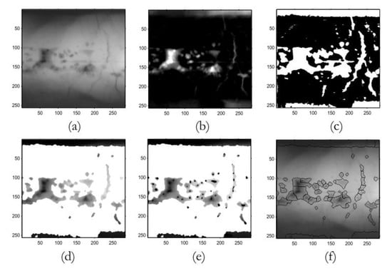 Summary of the proposed segmentation process: (a) image-altering the application of the median filter. (b) Application of the Bottom-Hat filter. (c) Application of binary thresholding. (d) Application sectioning process. (e) Modification of minima. (f) Application of the Watershed transformation [].