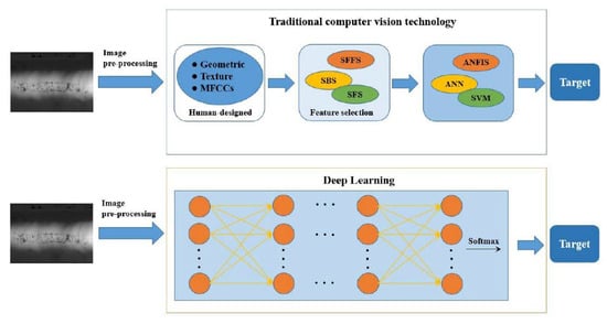 In the focus of this paper, Chen developed a system for recognizing diverse types of defects from images inspired by the human visual inspection mechanism. The method which is an unsupervised algorithm learned a dictionary from lots of normal images replacing the experienced workers. The dictionary can be used to sparsely reconstruct the background and the weld region of test images without the defective regions. Thus the defects would stand out in difference image between the test image and the reconstructed image []. Yang proposed a model-based on CNN to classify the X-ray weld images by improving the convolution kernel and the activation function. The method doesn’t need noise reduction, the feature extracting and enhancing []. Based on the principle of visual perception, Li constructed a deep learning network with 10 layers to directly determine the type of suspected defect. The network can judge whether the defect is linear or circular without extracted features []. Ye designed online segmentation and recognition method based on the compressed sensing for weld defect. The method firstly established offline database of defects images, then segmented the defect using clustering method, lastly determined the type of defects using the optimal dictionary whose atoms are characteristic values of defects. Hou developed a model based on a deep convolutional neural network (DCNN) to extract the deep features directly from the X-ray images without any preprocessing operation. The performance of deep feature was compared with those of traditional designed feature, such as texture features and histogram of oriented gradients features. The results showed that the separability of deep features is better []. Figure 4 shows the difference of traditional computer vision technology based on the above-mentioned technologies and the deep learning approach.