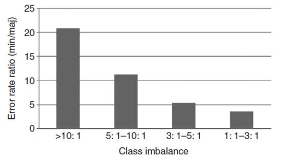 There is an intrinsic problem in the domain of weld inspection as in many other domains such as fraud detection, oil spill detection. It is just the class imbalance problem, namely the number of examples of one class is much higher than the others. The classifier tends to obtain high accuracy over the majority class, but poor accuracy over the minority class. Figure 5 presents that class imbalance leads to poorer performance when classifying minority class. The weld defect detection is just the problem of classification for minority class. Boaretto carried out the identification of the defects successfully. However, they failed on the attempt of classifying the defects due to the unbalanced data generated by the few samples of each defect type []. Liao studied the imbalanced data problem in the classification of different types of weld flaws. He used eight evaluation criteria to study the effectiveness of 22 data preprocessing methods for dealing with imbalanced data. The results indicated that some preprocessing methods do not improve any criterion, and they vary from one classifier to another []. These preprocessing methods solved the problem from only the perspective of data. The literature involving improving algorithms to deal with the imbalance learning for weld defect inspection is still few.