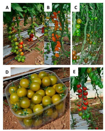 Tomato cultivars from Fondi area (Lazio region): (A) Fiaschetta di Fondi; (B) Bamano; (C) King Creole; (D) DulceMiel; (E) Sugarland.
