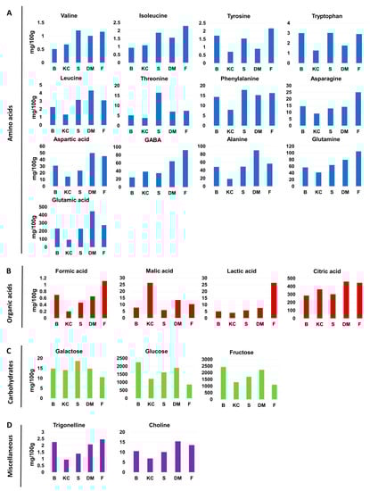Histograms comparing the level of metabolites present in tomato hydroalcoholic extracts from the five investigated cultivars: (A) Amino acids; (B) Organic acids; (C) Carbohydrates; (D) Miscellaneous (B: Bamano, KC: King Creole, S: Sugarland, DM: DulceMiel, F: Fiaschetta). Data shown are expressed as mg/100 g FW.