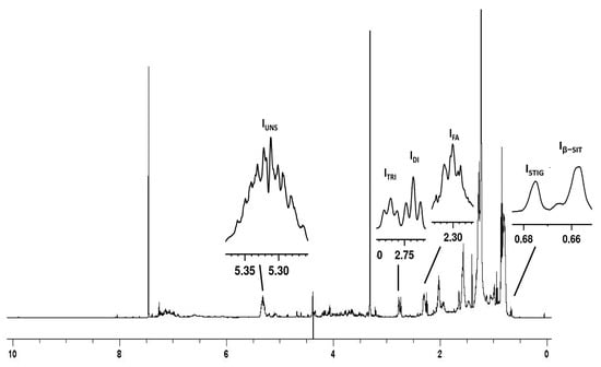 In the upfield spectral region, the CH3-18 signals of β-sitosterol at 0.66 ppm (Iβ-SIT), and stigmasterol at 0.68 ppm (ISTIG) were detected and quantified (Table 3 and Figure 3 and Figure 4). The resonance centered at 2.30 ppm (IFA) was ascribed to α-CH2 of all fatty acid chains. Resonances at 2.73 (IDI) and 2.77 ppm (ITRI) were ascribed to diallylic CH2 of linoleic and linolenic acids. The multiplet at 5.31 ppm (IUNS) belongs to double bond CH groups of all unsaturated fatty acids.