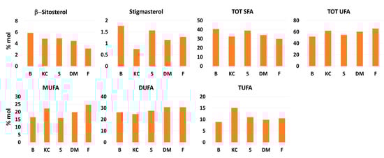 where %β-SIT, %STIG, %TRI, %DI, %MONO, %SAT are molar % of β-sitosterol, stigmasterol, tri-unsaturated fatty acids, di-unsaturated fatty acids, mono-unsaturated fatty acids, and saturated fatty acids, respectively. Iβ-SIT, ISTIG, ITRI, IDI, IUNS, IFA are integrals (see Table 2), and Itot is calculated according to the Equation (7)