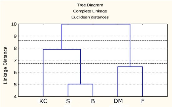 Dendrogram (TCA) showing the clustering, based on NMR data (both hydroalcoholic and organic metabolites quantified) of F: Fiaschetta, B: Bamano, DM: DulceMiel, S: Sugarland, KC: King Creole. Two levels corresponding to a different number of groups are marked.