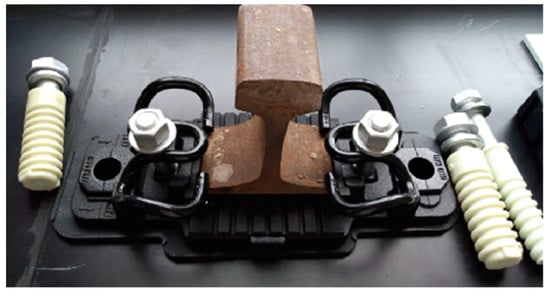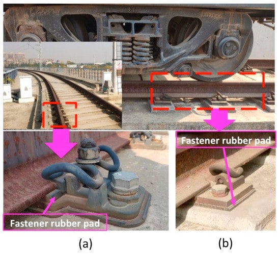 In terms of the HSR infrastructure system, various advancements have been developed and also applied in the engineering, such as the China Railway Track System (CRTS) series slabs [5]. In addition to slabs, the fastener serves as an essential component to mitigate the vibration in the rail system. The fastener has several categories depending on various conditions; for instance, the fastener for normal speed railway systems shall differ from those applied for the HSR system. The HSR system has more than 10 kinds of fasteners, which are designed regardless of distinct engineering circumstances. Figure 1 illustrates two kinds of fasteners and their rubber pads. The mechanical properties of the fasteners can largely affect the dynamic responses of the vehicle-rail-viaduct coupling system [5,6]. In the fastener’s system, the stiffness of the fastener rubber pad contributes 94% to the whole stiffness of the fastener’s system, and therefore, the stiffness of the fastener rubber pad can be considered as the whole stiffness of the fastener’s system [7]. Since the fastener rubber pad is made of rubber, the stiffness has close relation to the temperature [8]. Considering such temperature-dependent phenomena, extensive investigations have been conducted for studying certain effects. Ahmad et al. [9] studied the temperature-dependent stiffness of the rubber in the dynamic vibration absorber; Zhao et al. [10] conducted temperature sweep tests for rubber, and analyzed the temperature-dependent stiffness of rubber material; Wei et al. [11,12,13] investigated temperature-dependent stiffness of the fasteners in the subway system, and studied the nonlinear behavior of the temperature dependent stiffness of the fasteners; Liu [14] conducted temperature sweep tests for the fastener rubber pad, and found that at low temperatures, the fastener rubber pad shows low temperature sensitive performance, which further affects the vibration responses of the coupled system.