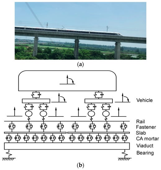 In recent years, high-speed railway (HSR) has been widely constructed in a lot of countries and HSR has also extensively transported a large amount of passengers and vast amount of goods, which enables the possibility of long-distance fast travelling and fast goods transportation. Meanwhile, as wide use of HSR, the corresponded problems such as vehicle-induced vibration have made the vehicle-rail-viaduct coupling system worse and worse. An in-depth understanding of the vehicle-rail-viaduct coupling system under complex circumstances shall be indispensable for enhancing the quality and long-term service of HSR infrastructure system [1,2,3,4]. For instance, in [3], the power flow method is applied to analyze the dominant vibration frequencies of the rail bridges for structure-born noise; in [4], the acoustic modal contribution analysis is applied to study the structural noise mitigation performance for the box-girder viaduct.