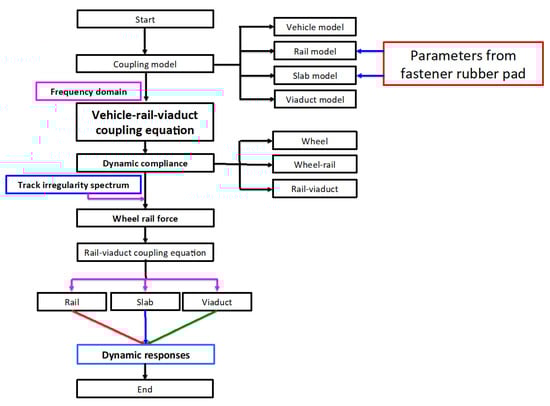 The vehicle-rail-viaduct coupling model is built firstly in frequency domain, by incorporating the dynamic flexibility of each sub-system with the track irregularity spectrum of the rail, the wheel-rail contact force is then obtained; and by substituting the wheel-rail contact force into the dynamic motion equation, the responses of each subsystem including vehicle, rail, and viaduct are eventually determined, respectively.