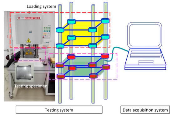 This study takes the WJ-7B small resistance fastener rubber pad from the HSR system as a test objective shown in Figure 4. In Figure 4, the pad below the rail was the fastener rubber pad. The specimen took cylinders, the 500 N Dynamic Mechanical Testing Machine, Analyzing and Testing DMA GABO Instruments, shown in Figure 5, enabled the conduction of temperature sweep tests for extracting the temperature dependent Young’s modulus [14]. The testing frequency was set as 2 Hz, and temperature range was [−60, 40] °C. The temperature interval was 20 °C in the temperature sweep test. 20 °C is the typical operating temperature.