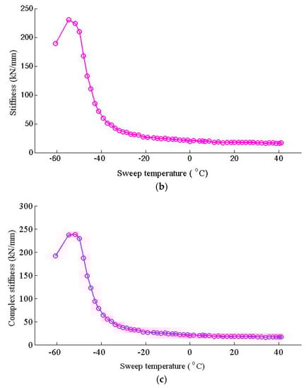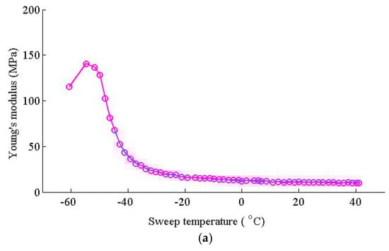 The temperature dependent Young’s modulus of the fastener rubber pad is shown in Figure 6a. Below −55 °C, the Young’s modulus of the fastener rubber pad increased as the temperature increased, and under such a low temperature that it was in a glassy state, the Young’s modulus was relatively high; as the temperature increased beyond −55 °C, the Young’s modulus of the fastener rubber pad decreased sharply; and when the temperature increased beyond −20 °C, the Young’s modulus of the fastener rubber pad decreased pretty slowly.
