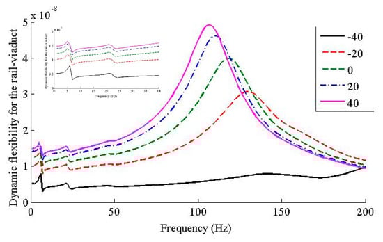 Figure 7 shows the dynamic flexibility amplitude of the rail-viaduct for all five scenarios. From Figure 7, the dynamic flexibilities of the rail-viaduct for all five scenarios showed peaks around 5 Hz, and the dynamic flexibilities increased as then temperature increased, while the peak frequency shifted leftward; in addition, the peak frequency was the first order resonant frequency of the rail-viaduct vertical coupling system, which implies that the temperature dependent performance of the fastener rubber pad had little effect to such first order resonant frequency; in frequency range [0, 107] Hz, the dynamic flexibilities of the rail-viaduct increased as the temperature increased; in frequency range [107, 144] Hz, the ratios of the peaks of the rail-viaduct’s dynamic flexibilities to the peak under first scenario were 100%, 389.3%, 506.6%, 586.1%, 624.6%. As the temperature increased for the fastener rubber pad, the peaks of the dynamic flexibilities of the rail-viaduct increased, and the resonant frequency peaks shifted leftward. Table 4 gives the exact first order resonant and dominant frequencies for five scenarios. The dominant frequencies change more than the first order resonant frequencies for the same scenario in comparison to the Case #1.