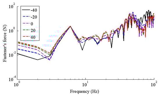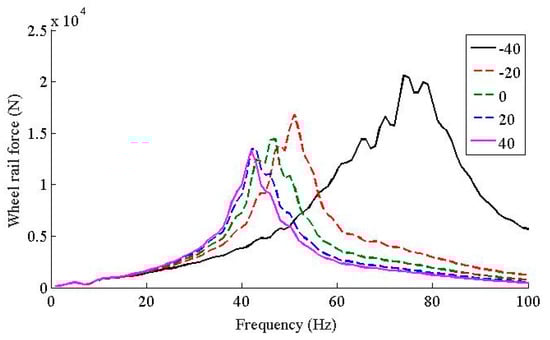 Figure 8 shows the wheel-rail contact forces under five scenarios. From Figure 8, it can be found that: (1) below 20 Hz, the temperature dependent Young’s modulus of the fastener rubber pad of the fastener had little effect to the wheel-rail force; (2) in frequency range [20, 42] Hz, the amplitude of the wheel-rail force increased sharply as the temperature increased; (3) as the temperature increased, the peaks of the wheel-rail forces for all five scenarios decreased, and so did the dominant frequencies; the dominant frequencies for five scenarios were 74, 51, 47, 43 and 42 Hz, respectively; (4) In frequency range [56, 100] Hz, as the temperature decreases, the wheel-rail forces increased.
