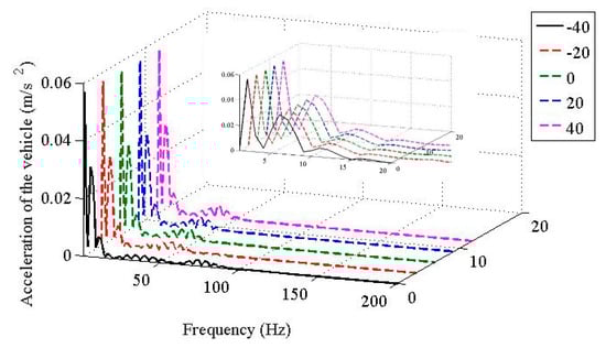 Figure 9 and Figure 10 illustrate the accelerations of the vehicle body and the wheelset, respectively. Because the responses of the vehicle mainly occupy the frequency range below 20 Hz, this study takes the frequency range [0, 20] Hz for further investigation. From Figure 9, for all five scenarios, the vertical accelerations of the vehicle had little difference, which suggests that the temperature dependent Young’s modulus of the fastener rubber pad had little influence to the vertical responses of the vehicle on such occasion. In Figure 10, for all five scenarios, regarding to the frequency range below 20 Hz, the temperature dependent Young’s modulus of the fastener rubber pad had little influence to the vertical responses of the wheelset; while as temperature increased, the peaks of the vertical accelerations decreased gradually, and the dominant frequencies also decreased.