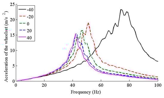 Vertical acceleration of the wheelset under −40, −20, 0, 20, and 40 °C.