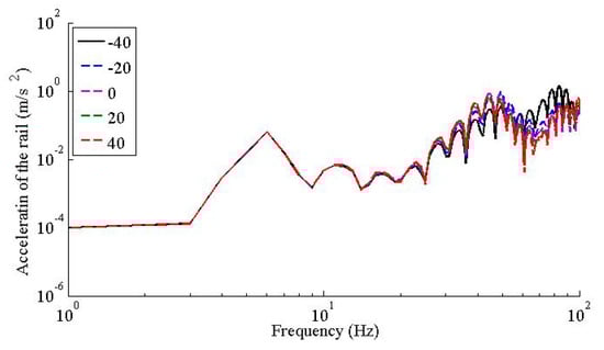 Vertical acceleration of the rail under −40, −20, 0, 20, and 40 °C.