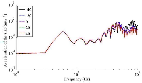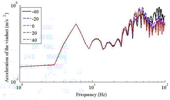 Figure 11, Figure 12, Figure 13 and Figure 14 illustrate the fastener’s force, accelerations of the rail, slab, and viaduct, respectively. From Figure 11, Figure 12, Figure 13 and Figure 14, the temperature dependent Young’s modulus of the fastener rubber pad had similar influence to the acceleration responses of the rail, slab and viaduct. Taking the acceleration response of the viaduct as example, in frequency range below 30 Hz, the vertical accelerations of the viaduct for all five scenarios had little difference, which suggests that the temperature dependent Young’s modulus of the fastener rubber pad had little influence to the acceleration response of the viaduct; for all five scenarios, the acceleration peaks of the viaduct decreased gradually as the temperature increased; the dominant frequencies were 84 Hz, 49 Hz, 44 Hz, 44 Hz, and 44 Hz, respectively, for five scenarios, which implies that the dominant frequencies decreased to a certain value and tended to be constant as the temperature increased.