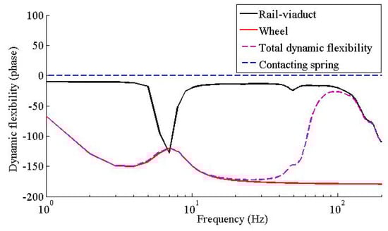 Figure 19 shows the phase of the dynamic flexibility obtained by the dynamic flexibility method, the phase of the contacting spring keeps constant, and the phase of the dynamic flexibility of the rail-viaduct reaches a lower peak at 7 Hz. All these results agree well with the results obtained in [26]. This also implies the feasibility of the proposed method in analyzing the vibration characteristics of the vehicle-rail-viaduct system.