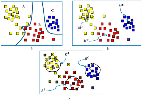 (a) An exemplary dataset with three clusters; (b) the assumptive cluster centers of applying kmedoids on the given dataset; and (c) removing unreliable data points in each cluster. In (a) and (b), dots mean the representative centers of clusters, and crosses means removed data points or unreliable data points.
