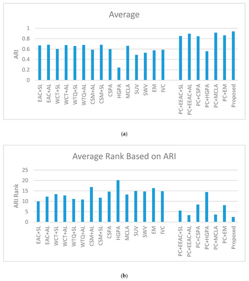Different consensus functions have been first used to extract the final clustering result out of the output ensemble of the Algorithm 1. As it is clear, the clustering results in the output ensemble of the Algorithm 1 are not complete; therefore, to apply EAC on the output ensemble of the Algorithm 1, edited EAC (EEAC) is needed [64,65]. CSPA, HGPA, and MCLA are also applied on the output ensemble of the Algorithm 1. EM has been also used to extract the final clustering result out of the output ensemble of the Algorithm 1. Therefore, seven methods including PC + EEAC + SL, PC + EEAC + AL, PC + CSPA, PC + HGPA, PC + MCLA, PC + EM, and the proposed mechanism presented in Section 3.4 have been used as different consensus functions to extract the final clustering result out of the output ensemble of the Algorithm 1. Here, PC stands for the proposed base clustering presented in Algorithm 1. Experimental results of different ensemble clustering methods on different datasets in terms of ARI and NMI have been presented respectively in Figure 4 and Figure 5. The last seven bars stand for performances of the seven mentioned methods. All these results have been summarized in last seven rows of Table 4. The proposed consensus function presented in Section 3.4 is the best method and the PC + EEAC + SL consensus function is the second. According to Table 4, the PC + EEAC + AL and PC + MCLA consensus functions are the third and fourth methods. Therefore, the proposed mechanism presented in Section 3.4 is considered to be our main consensus function.
