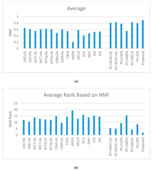 Experimental results of applying different consensus functions considering the output ensemble of the Algorithm 1 on different datasets in terms of (a) normalized mutual information (NMI) and (b) rank of normalized mutual information (NMI Rank).