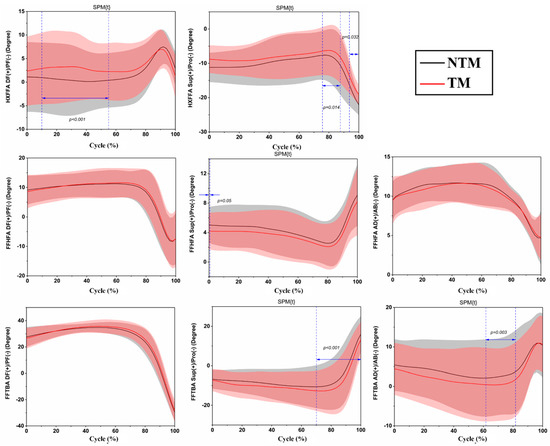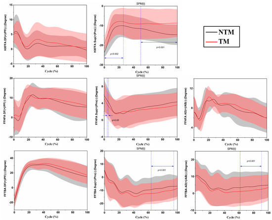 Figure 3 exhibited the foot inter-segment angle comparison during landing under NTM and TM conditions. The greater pronation after manipulation was found in HXFFA with p = 0.002 and p < 0.001 (0%–26% and 50%–100%). The range 4%–6% showed a smaller supination with p = 0.05, for FFHFA. Pronation was smaller after manipulation in 64%–95% of the frontal plane of FFTBA (p < 0.001). Adduction was smaller with p < 0.001 in the transverse plane at 62%–91% of landing.