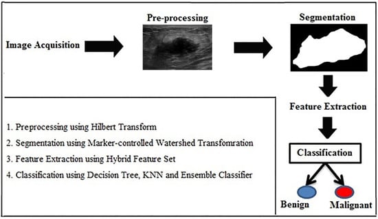 Breast cancer (BC) is one of the main reasons of demises among women worldwide [1]. According to the report, one out of twelve female may be affected with BC. The World Health Organization (WHO) documented that, approximately 508,000 women died due to this disease in 2011 [2]. In spite of this, it is possible to defeat breast cancer if it is diagnosed at the initial stage. The mammography imaging is considered an appropriate method of breast cancer diagnosis. However, BUS is employed as the supportive tool to assess mammographic finding, profound masses, indecisive mammograms, and to guide biopsies [3]. BUS is also the main procedure prescribed to assess breast ailments in females especially below the age of 30 due to low cost and easy access that can accurately differentiate those types as compared to other imaging procedures. However, proper diagnosis by BUS involves trained and experienced radiologists to identify dense and cystic breast lesion. The report of radiologist is based on visual inspection of BUS images only, so it is difficult to diagnose it as malignant or benign [4,5]. Furthermore, BUS is operator-dependent modality [5] that comprises artifacts (i.e., speckle noise etc.), which degrades the image quality. CADx systems using machine learning approaches can be developed for diagnosis of breast anomalies and tumors classification. The CADx system assists radiologists in the evaluation of breast abnormalities with reliability and accuracy [6,7]. Furthermore, CADx may avoid extra efforts during an examination and diagnostic errors of physicians that are made due to fatigue and workload.