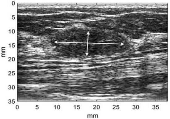 B-mode (brightness) image of the lesion, the image was reconstructed based on the set of radio-frequency (RF) signals (510 RF lines, 1824 samples in every line, and penetration depth = 35.76 mm), where white arrows indicate the lesion [26].