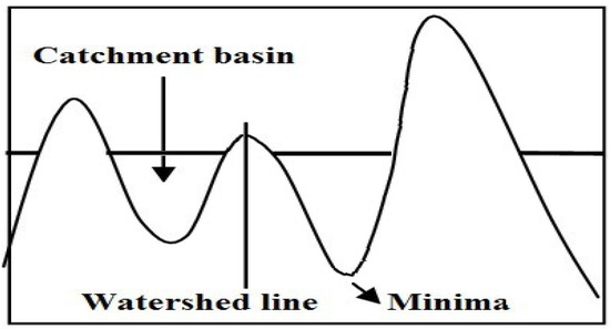 Watershed transformation is a region-based method [31]. The idea of watershed is based on visualizing an image into its topographical view. Figure 3 illustrates the topographic view of an ultrasound image in which the bright portions cover “high” altitudes and dark contain “low” altitudes. Every local minima of an image includes a hole through which water is supplied into various catchment basins. The catchment basins are filled up with water starting from the bottom (i.e., minima of lowest intensity), and continue to high until water level attains the top peak in the topography. Dams are built to avoid the joining of water originating from two or more local minima. Consequently, the topography is divided into regions, also called catchment basins parted by dams, known as watershed lines or watersheds. The quantity of objects that are n outcome of segmentation relies upon the quantity of local minima that occurs in the image. Thus, the existence of several local minima in the object creates the problem of over-segmentation.