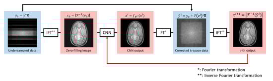 Figure 1 presents a sequential schematic of the proposed method, which iteratively processes image-based CNNs and k-space corrections, with the CNNs representing a priori image space information. The method aims to preserve information pertaining to tissue structures and to suppress aliasing artifacts to a larger degree compared to standalone image-based CNN and noniterative k-space correction methods. As indicated in Figure 1, first, undersampled k-space data, y0, are extracted from the corresponding fully sampled data using a binary sampling mask, R, and zero-filling images, x0, are obtained using the inverse Fourier transformation, . Subsequently, the CNNs are trained to map these zero-filling images onto the corresponding fully sampled images, and k-space corrections are performed to replace the unsampled data by the original k-space data [23]. Finally, is used to obtain the corrected images from the corrected k-space data. The above-mentioned processes are performed iteratively. Note that in all iterations except the first, CNNs are trained to map the ith output onto the corresponding fully sampled image. The calculations performed by the proposed method can be expressed by the following: