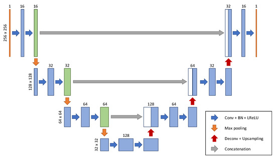 Figure 2 depicts a schematic of the 2D U-net architecture comprising independent encoding (left) and decoding (right) workflows. The encoding workflow corresponds to that of typical CNN architectures, which are constructed by repeatedly using two 3 × 3 2D convolutional layers. The processing within each such layer is followed by batch normalization (BN), the use of a leaky rectified linear unit (LReLU), and 2 × 2 max pooling for downsampling. Additionally, the number of feature channels is doubled during each downsampling step. In contrast, the decoding path comprises a 3 × 3 2D deconvolutional layer. The processing within this layer is followed by BN, an LReLU, upsampling, and skip connection with the corresponding linked-feature maps in the encoding path, and two 3 × 3 2D convolutional layers. The processing within each of these two layers is—once again—followed by BN and an LReLU. A linear function was employed to activate the output layer.