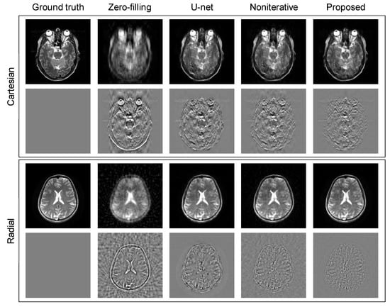 Image reconstruction results obtained with a sampling mask of 10%. Columns correspond to ground truth and results obtained using the zero-filling, image-space-treated U-net, other noniterative, and proposed iterative methods (left to right). Rows correspond to the Cartesian and radial sampling masks of reconstructed images and error maps compared to fully sampled images.