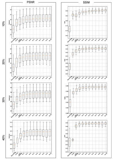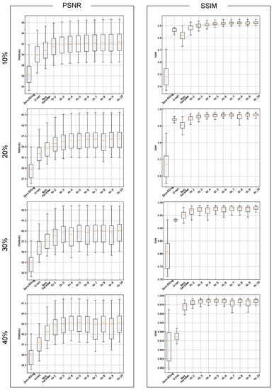 Figure 5 and Figure 6 show the box plots of the PSNR and SSIM values obtained with Cartesian and radial sampling masks of 10%, 20%, 30%, and 40%. The columns correspond to the zero-filling, image-based U-net, and noniterative methods and each iteration of the proposed method (left to right). In each plot, the yellow line within the box represents the median; the lower and upper lines of the box represent the 25th and 75th percentiles, respectively; and the lower and upper adjacent lines (whiskers) represent the minimum and maximum values, respectively. Ten iterations of the proposed method outperformed the image-based U-net and the noniterative methods for all Cartesian and radial sampling masks. In addition, the SSIMs from the noniterative method with a Cartesian sampling mask of 10% (Figure 5) and radial sampling masks of 10% and 20% (Figure 6) are lower than those from the image-based U-net and proposed methods. During training, the proposed method converges within ten iterations in terms of the PSNR and SSIM. These findings demonstrate the effectiveness of the proposed iterative method.