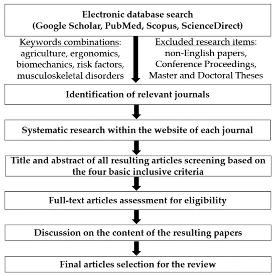 With the intention of finding recent journal articles associated with “ergonomics in agriculture”, the search engines of Google Scholar, PubMed, Scopus, and ScienceDirect were utilized. To this end, combinations of the keywords “agriculture”, “ergonomics”, “biomechanics”, “risk factors”, and “musculoskeletal disorders” were used. In particular, when a paper was being found, a systematic research was being performed within the website of this specific journal in order to seek for relevant studies. Subsequently, additional articles were being found from the reference list of the resultant journal papers. This process was iterated until no other relevant paper existed. The date for the last search was 15 December 2019.